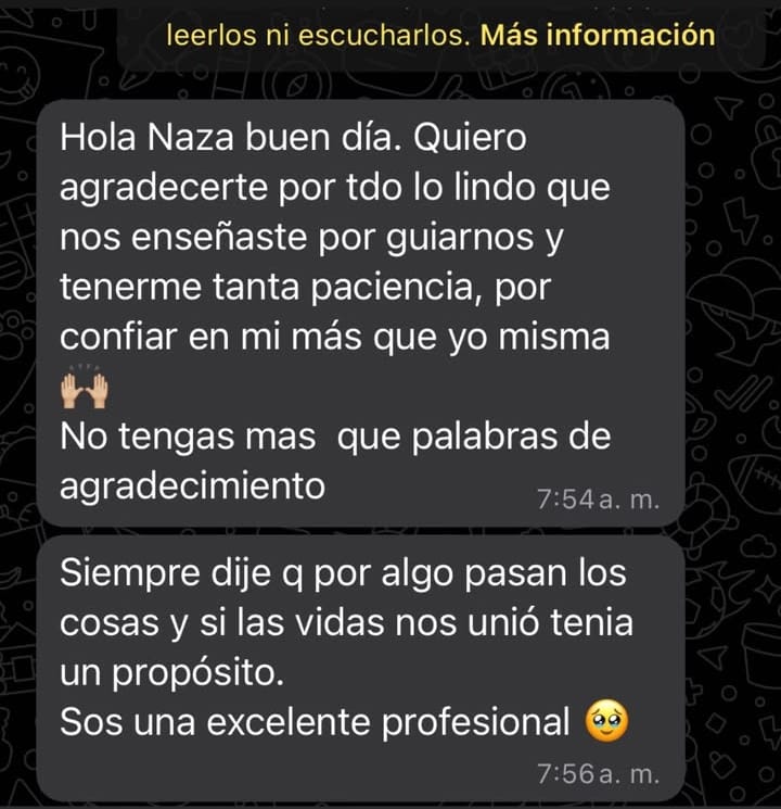 No me había abierto nunca los registros y me encanto que haya sido con vos la primera experiencia, me senti comoda y en confianza. Resone conn todo lo que leí y hubo cosas que siento que eran necesarias “recordar” para seguir en eje.. gracias Naza! Sin dudas voy a recomendarle a mis amigas este encuentro espiritual con vos ♥